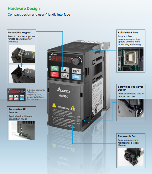 Deltina MS300 serija je nova generacija kompaktnih vektorskih regulatora koja zadržava Deltin izuzetan standard tehnologije izrade frekventnih regulatora, ali sa 40% manjom veličinom. Razne osnovne funkcije su ugrađene kao standard, uključujući: PLC za jednostavne potrebe programiranja (2000 stepova), komunikacioni slotovi za različite komunikacione kartice i USB port za otpremanje i preuzimanje podataka brzo i lako. Tim se smanjuje potreba za dodatnim hardverom, istovremeno pružajući više prostora za instalaciju unutar kontrolnog ormana. MS300 takođe podržava asinhrone kao i motore sa permanentim magnetima (unutrašnjim i spoljašnjim), pružajući dodatnu efikasnost i fleksibilnost. STO funkcija obezbeđuje nesmetan rad, a novi dizajn ožičenja terminalnih blokova bez šrafova nudi pojednostavljen proces ožičenja za brzu instalaciju.