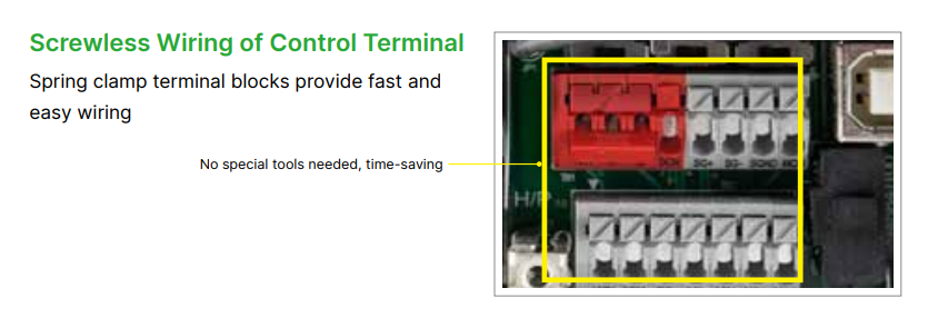 - Mogućnost side-by-side instalacije (bez razmaka izmedju susednih frekventnih regulatora unutar ormana) na radnim temperaturama od -20°C do 40°C