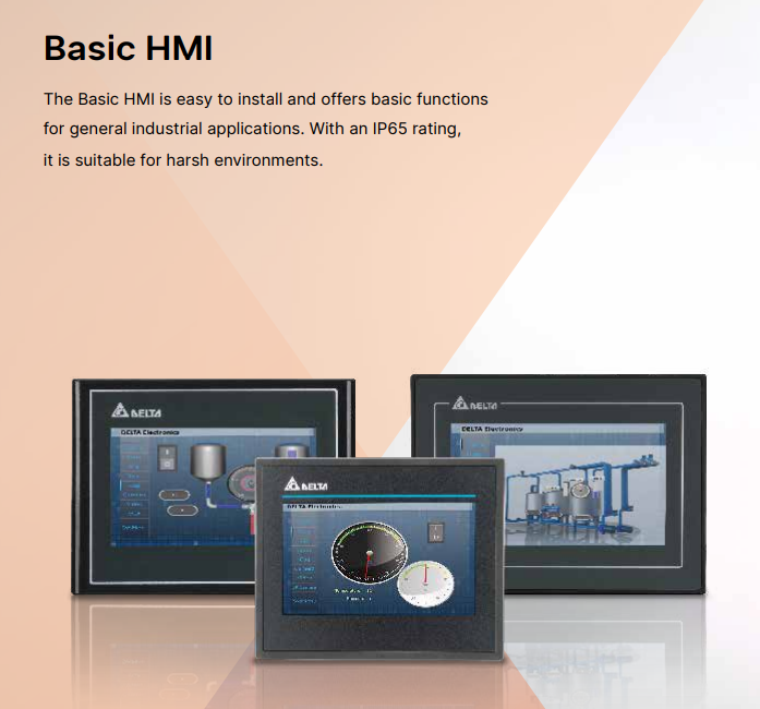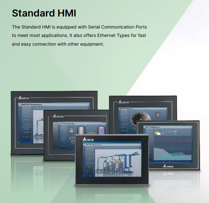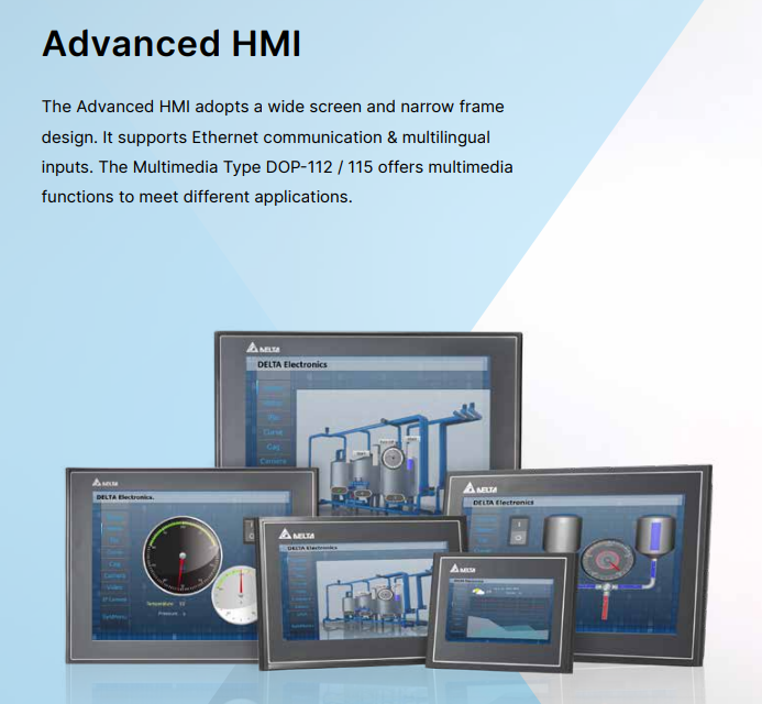 - Delta DOP 100 serija operatorskih panela uključuje 4 kategorije za različite aplikacije: Basic (Osnovni), Standard, Advanced (Napredni) i Handheld (Ručni). Basic, Standard i Handheld modeli poseduju najnoviji Cortek-A8 (800MHz) procesor, dok Advanced HMI od 12″ / 15″ poseduje Dual Cortek-A7 (1GHz) procesor velike brzine. DOP 100 serija sadrži 16-bitne i 24-bitne LCD ekrane u boji sa visokom osvetljenošću i kontrastom. Pored toga, serija je opremljena softverom za programiranje operatorskih panela DIAScreen, ugrađeni Lua editor za lako programiranje, kao i funkcije alarma, istorije, autorizacije korisnika za visoko efikasno upravljanje.